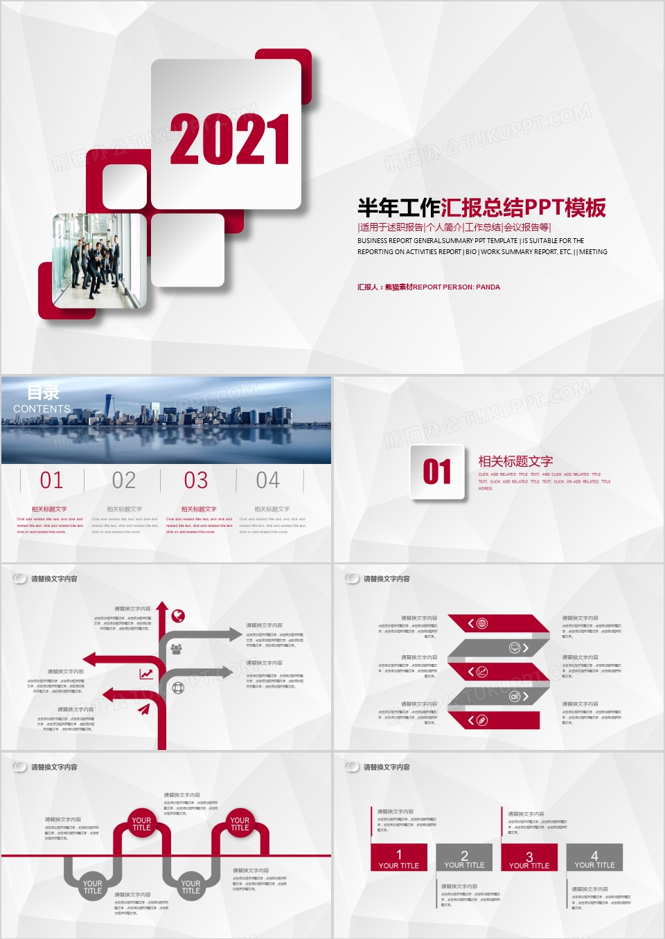 本作品全称为《红色简约半年工作汇报总结PPT模板》,主要应用Microsoft Office PowerPoint软件制作。作品配套了许多商务通用功能的图表元素,整体呈简约商务风格,可作为通用模板,使用者可以根据不同的主题添加或者修改文本内容。适用于述职报告、个人简介、工作总结、会议报告等用途。, 格式为 pptx, 大小8 MB, 页数为26,比例450:253, 请使用软件PowerPoint(2010)打开, 作品中主体文字及图片可替换修改,文字修改可直接点击文本框进行编辑,图片更改可选中图片后单击鼠标右键选择更换图片,也可根据自身需求增加和删除作品中的内容, 源文件无水印, 欢迎使用胖猫办公。