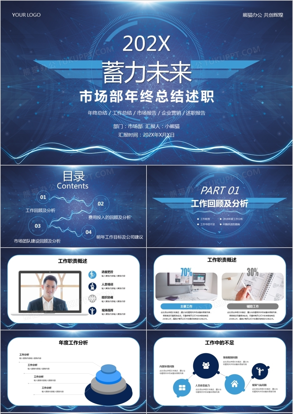 本作品全称为《宝石蓝未来科技风市场部年终工作总结计划PPT模板》,主要应用Microsoft Office PowerPoint软件制作。分为工作回顾及分析、费用投入的回顾及分析、市场团队建设回顾及分析、明年工作目标及公司建议四部分。作品以宝石蓝为背景,设计含有科技感的线条,整体呈科技风。适用于工作总结、述职报告、年终总结等用途。, 格式为 pptx, 大小45 MB, 页数为29,比例16:9, 请使用软件PowerPoint(2016)打开, 作品中主体文字及图片可替换修改,文字修改可直接点击文本框进行编辑,图片更改可选中图片后单击鼠标右键选择更换图片,也可根据自身需求增加和删除作品中的内容, 源文件无水印, 欢迎使用胖猫办公。