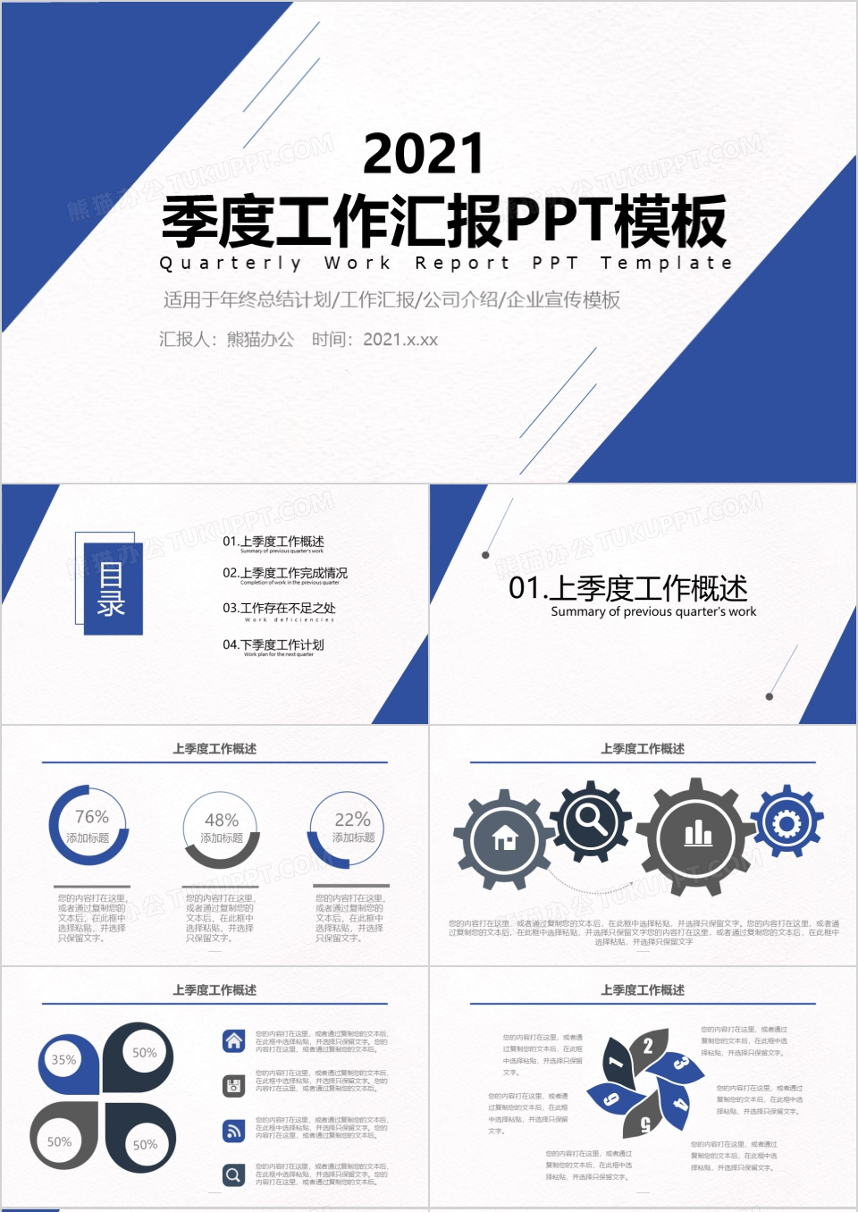 本作品全称为《2019简约商务风季度工作汇报工作总结PPT模板》,主要应用Microsoft Office PowerPoint软件制作。分为上季度工作概述、上季度工作完成情况、工作存在不足之处、下季度工作计划四部分。作品以蓝白色为背景,配套商务通用功能的图表元素,整体呈简约商务风格。适用于工作总结、工作汇报、工作计划等用途。,