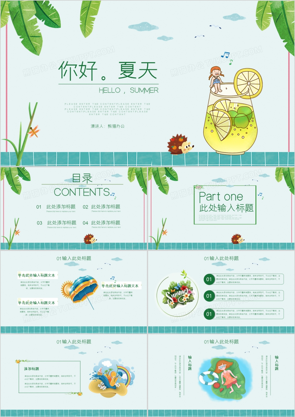 本作品全称为《清新唯美你好夏天通用动态PPT模板》,主要应用Microsoft Office PowerPoint软件制作。作品以蓝色为背景,搭配创意绿叶、刺猬等卡通图案,整体呈小清新风。可作为通用模板,使用者可以根据不同的主题添加或者修改文本容,适用于工作总结、教学课件、个人简历等用途。, 格式为 pptx, 大小40 MB, 页数为25,比例16:9, 请使用软件PowerPoint(2016)打开, 作品中主体文字及图片可替换修改,文字修改可直接点击文本框进行编辑,图片更改可选中图片后单击鼠标右键选择更换图片,也可根据自身需求增加和删除作品中的内容, 源文件无水印, 欢迎使用胖猫办公。