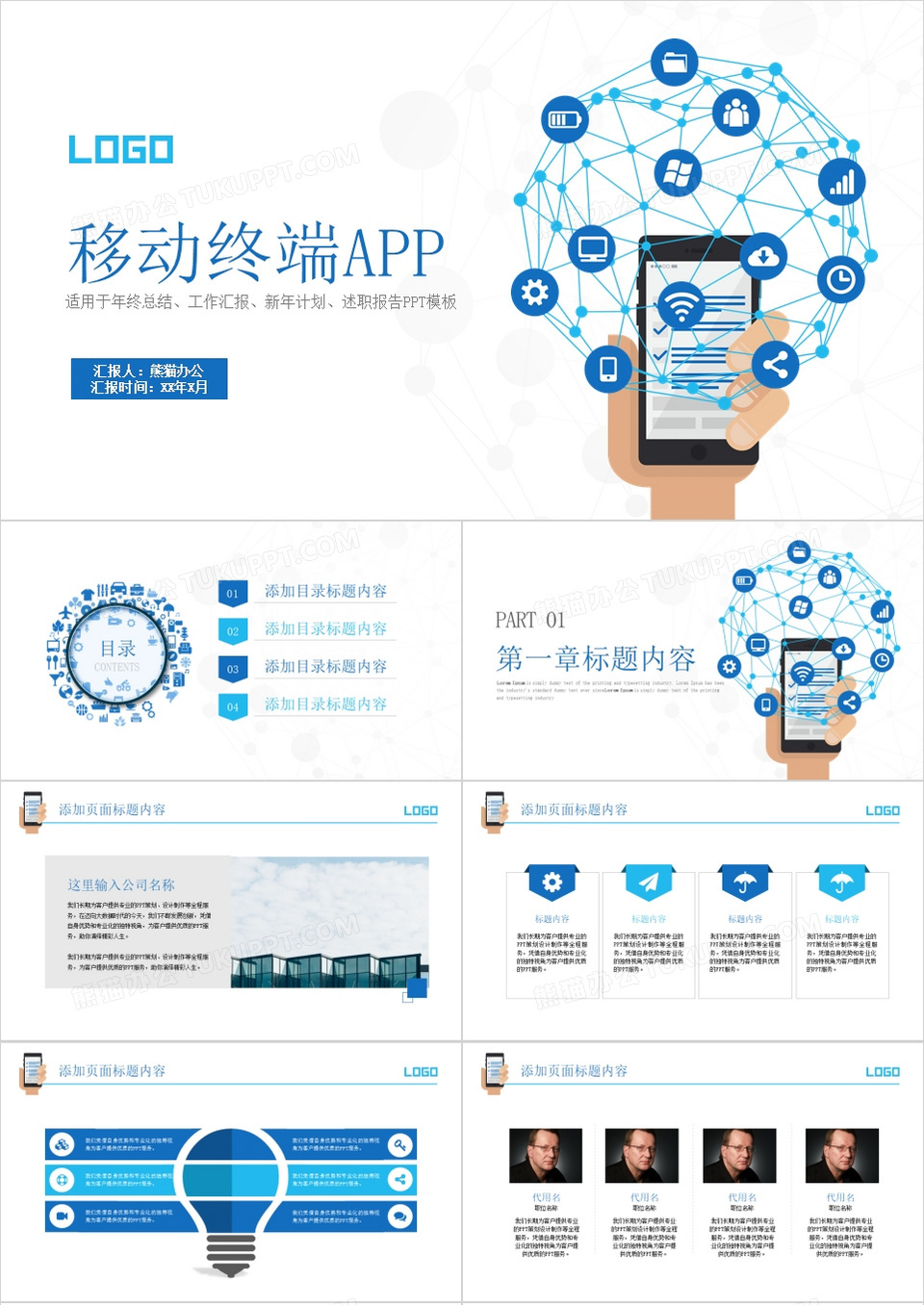 本作品全称为《蓝色扁平化风移动App通用PPT模板》,主要应用Microsoft Office PowerPoint软件制作。作品以白色为背景,作品配套了许多通用功能的图表元素,整体呈扁平化风格。可作为通用模板,使用者可以根据不同的主题添加或者修改文本容,适用于工作总结、工作计划、工作汇报等用途。, 格式为 pptx, 大小16 MB, 页数为32,比例16:9, 请使用软件PowerPoint(2010)打开, 作品中主体文字及图片可替换修改,文字修改可直接点击文本框进行编辑,图片更改可选中图片后单击鼠标右键选择更换图片,也可根据自身需求增加和删除作品中的内容, 源文件无水印, 欢迎使用胖猫办公。
