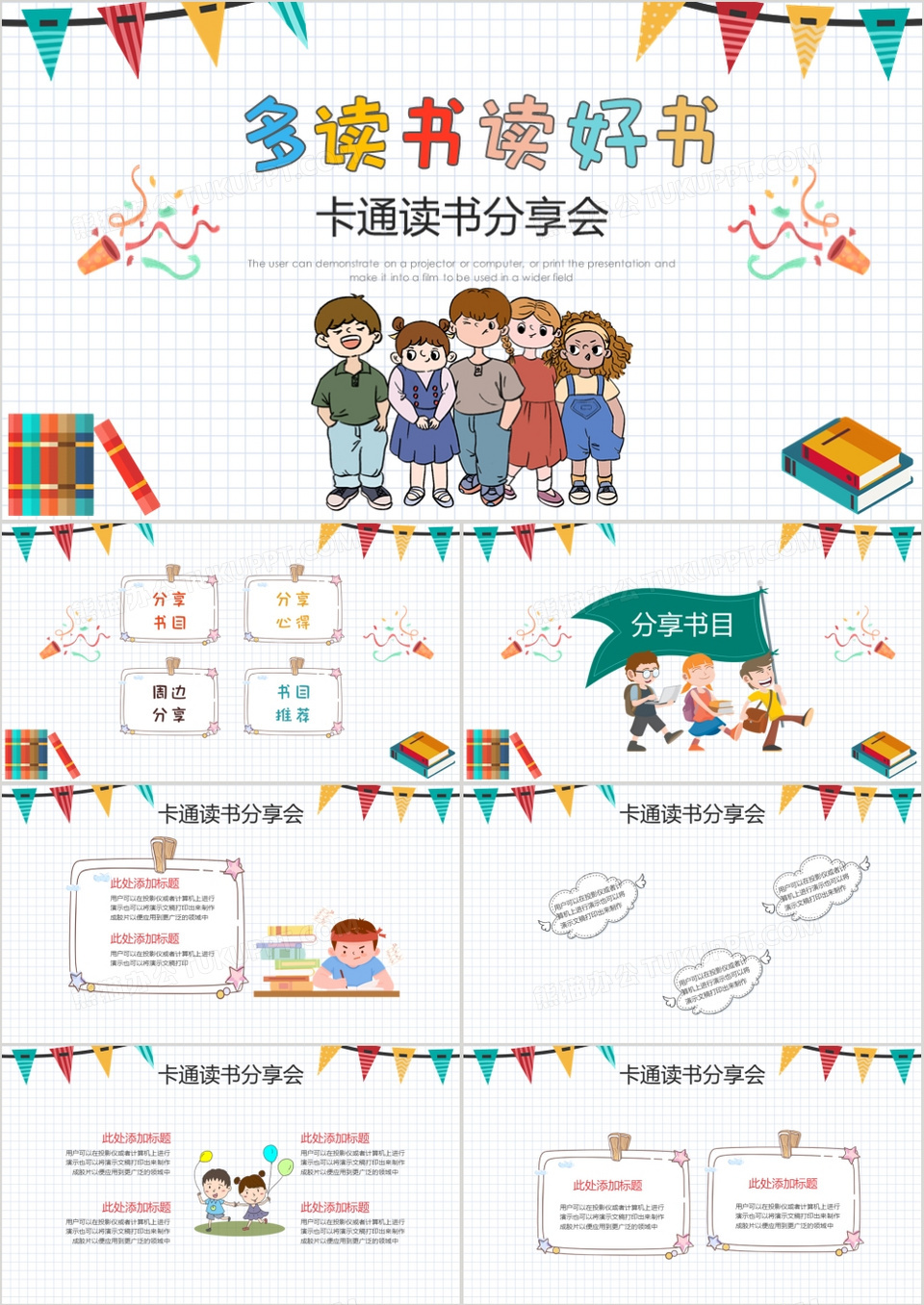 本作品全称为《卡通多读书读好书读书分享会PPT模板》,主要应用Microsoft Office PowerPoint软件制作。分为分享书目、分享心得、周边分享、书目推荐四部分。作品以白色为背景,搭配卡通人物、彩旗、书本等,整体呈卡通风。适用于读书分享、读书报告、读书推荐等用途。, 格式为 pptx, 大小11 MB, 页数为24,比例16:9, 请使用软件PowerPoint(2019)打开, 作品中主体文字及图片可替换修改,文字修改可直接点击文本框进行编辑,图片更改可选中图片后单击鼠标右键选择更换图片,也可根据自身需求增加和删除作品中的内容, 源文件无水印, 欢迎使用胖猫办公。